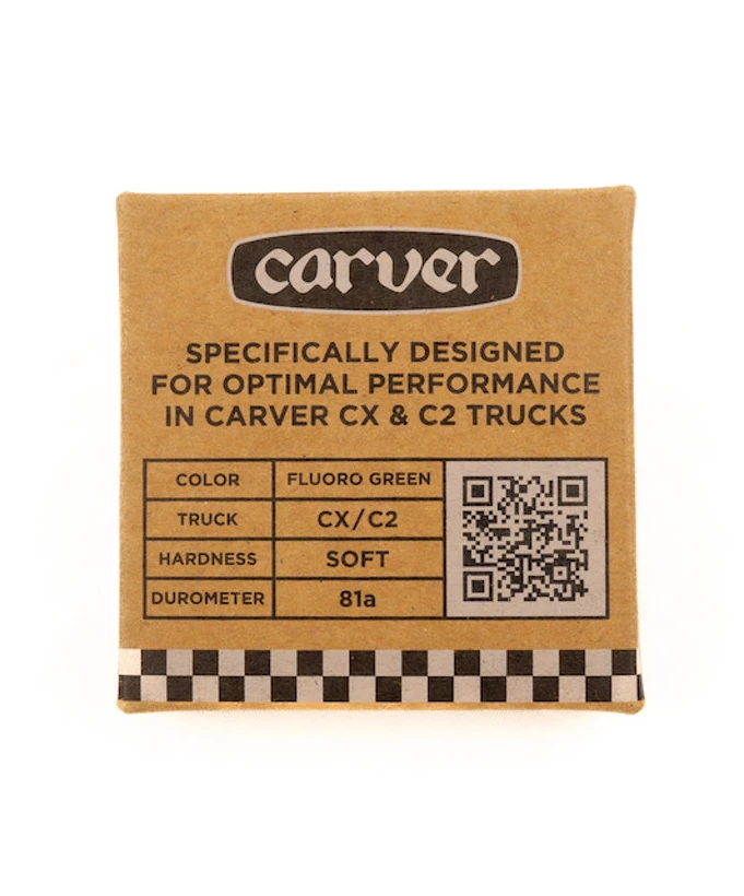 Carver CX Soft bushings are available in 81A durometer and best suited for lighter and younger riders. They flex more so are easier to turn, allowing a wider range of motion and tighter turning arc with less rail pressure. Comes in Green Glo.