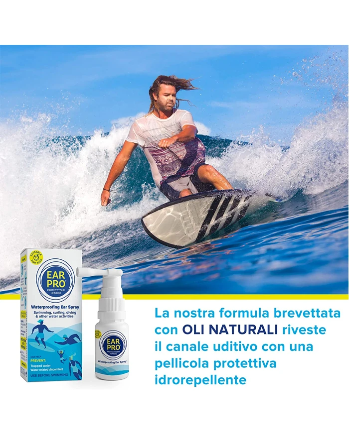 Trapped water in the ears is linked to short and long term hearing loss in water lovers around the world. Why take the chance? One spray in each ear before getting wet is all you need