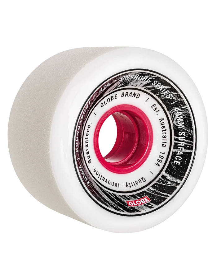 Rounded edge conical construction and superior rebound make the Roundabout Onshore Wheel in White/Red our best performing surf/skate wheel. Springy and highly durable, this wheel resists tearing during slides. Also featuring stoneground for traction from the first push.