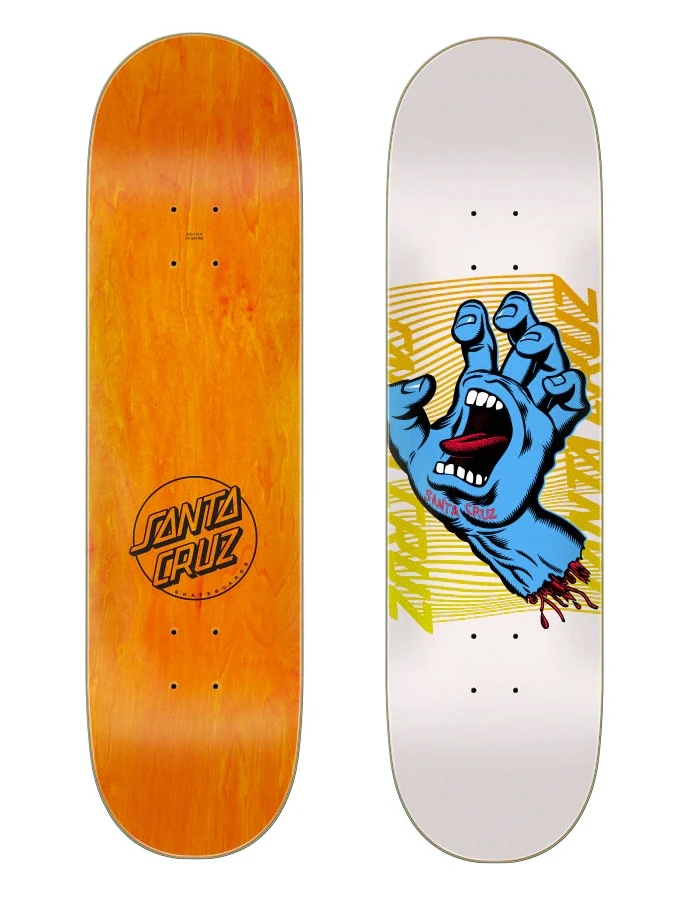Santa Cruz Skateboards Split Hand deck with spot gloss graphic on 7 ply northern birch hardwood deck pressed using specially designed crosslinked glue, creating a responsive and durable deck at an affordable price.