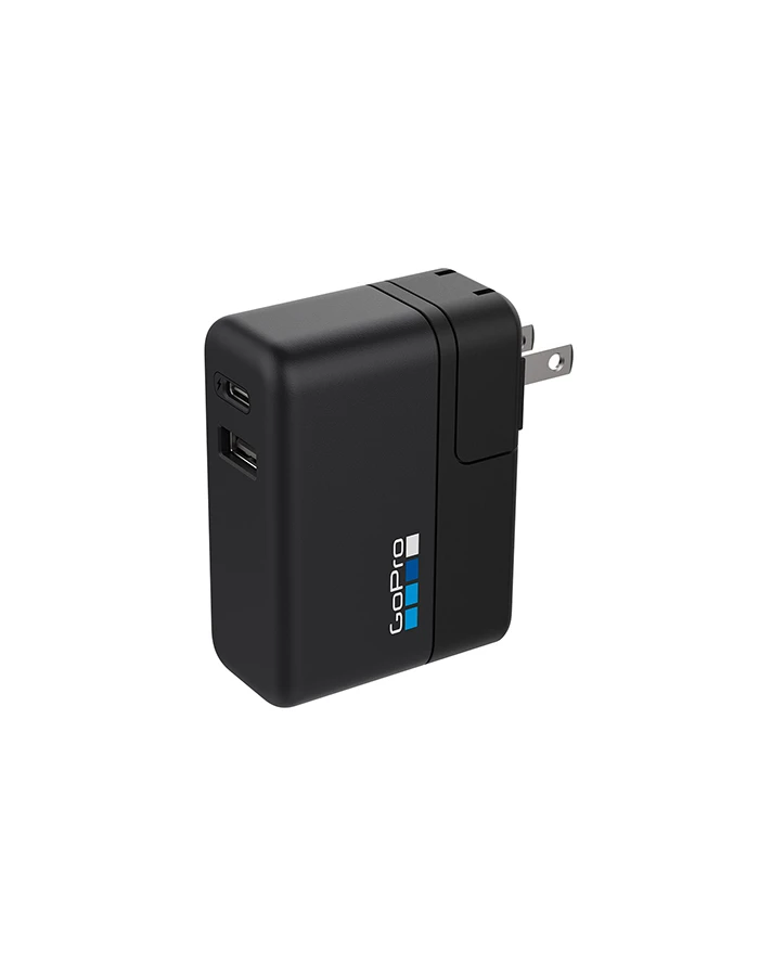 The fastest way to charge your GoPro, the 27.5W Supercharger (International Dual-Port Charger) lets you charge two GoPro devices simultaneously—anywhere in the world. The USB-C port offers 20 to 70% faster charging on fast-charge compatible devices1 compared to using a conventional charger.2Â